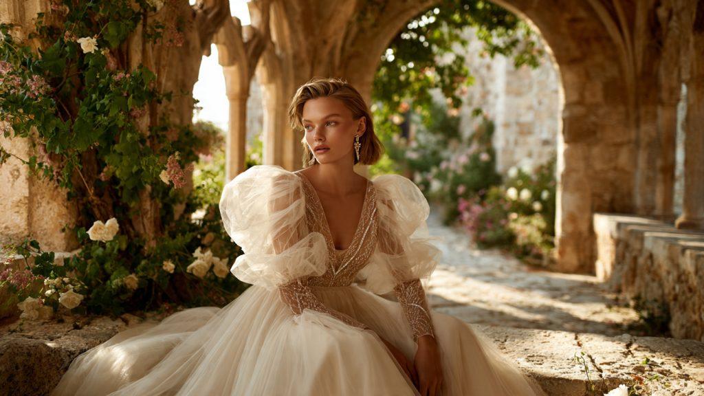 Transparentne, wielowarstwowe tiule lub bufiaste statement sleeves dodają sylwetce dramatyzmu. Są niezwykle fotogeniczne na sesjach plenerowych i chronią ramiona podczas wieczornego chłodu w ogrodzie.